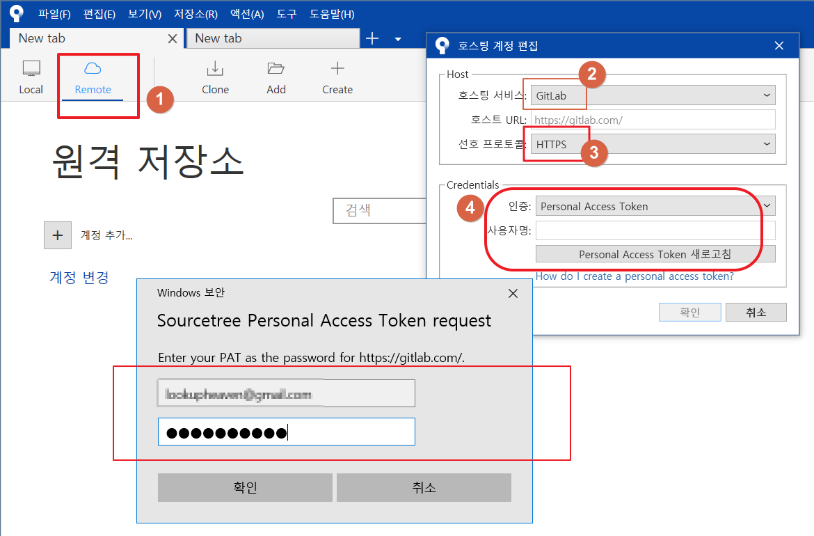 설치된 소스트리를 실행하여 원격저장소(Gitlab, github) 의 나의 계정정보를 설정하도록 한다.
