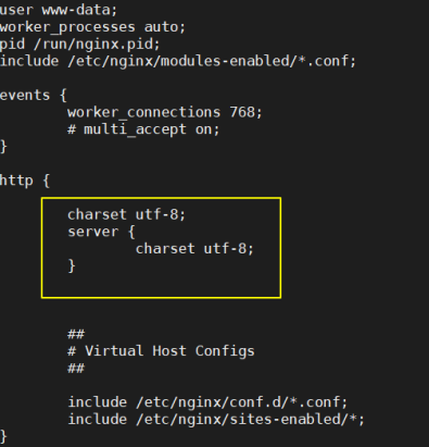 /etc/nginx/nginx.conf 파일을 열고, 한글코드를 설정해준다.